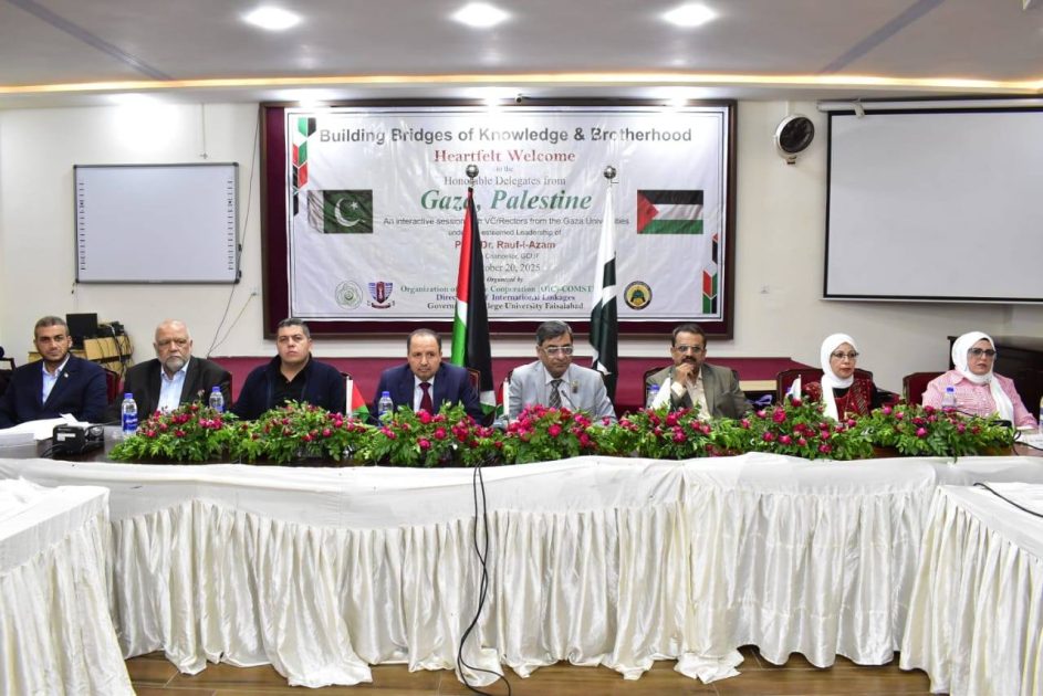 فلسطین اور غزہ کی جامعات کے وائس چانسلرز، صدور اور ریکٹرز پر مشتمل آٹھ رکنی وفد نے جی سی یونیورسٹی فیصل آباد کے نیو کیمپس جھنگ روڈ کا دورہ کیا۔ وفد کی آمد پر وائس چانسلر پروفیسر ڈاکٹر رؤفِ اعظم، فیکلٹی ممبران، انتظامی افسران اور طلباء نے ان کا والہانہ استقبال کیا۔ یہ وفد اسلامی تعاون تنظیم کے ذیلی ادارے کامسٹیک (COMSTECH) کے تحت پاکستان کے تعلیمی و تحقیقی اداروں کے ساتھ اشتراک اور تعاون کو فروغ دینے کے سلسلے میں دورہ کر رہا ہے۔ اس موقع پر کامسٹیک کے اسلام آباد میں کوآرڈینیٹر/فوکل پرسن محمد مرتضیٰ نور بھی وفد کے ہمراہ تھے۔ انہوں نے کہا کہ اس دورے کا مقصد غزہ میں حالیہ تباہی کے بعد تعلیمی اداروں کی بحالی بارے مشاورت، تعلیمی اصلاحات اور سائنسی تحقیق و اعلیٰ تعلیم کے فروغ کے لیے دونوں ممالک کے درمیان پائیدار روابط استوار کرنا ہے۔ قبل ازیں وفد کو جی سی یونیورسٹی کے مختلف شعبہ جات، جاری بین الاقوامی منصوبوں، عالمی درجہ بندی میں پوزیشن اور اکیڈمک ترقی کے حوالے سے بریفنگ دی گئی۔ وائس چانسلر ڈاکٹر رؤفِ اعظم نے کہا کہ جی سی یونیورسٹی نے پہلے ہی فلسطینی طلباء کے لیے خصوصی اسکالرشپس کا اعلان کر رکھا ہے اور مستقبل میں بھی فلسطینی طلباء کے لیے اسکالرشپس کے نئے مواقع فراہم کیے جائیں گے۔ انہوں نے انفارمیشن ٹیکنالوجی، میڈیسن، بائیولوجیکل، سوشل، اور نیچرل سائنسز میں فلسطینی جامعات کے ساتھ مشترکہ تحقیقی و تعلیمی منصوبوں پر کام کرنے کے عزم کا بھی اظہار کیا۔