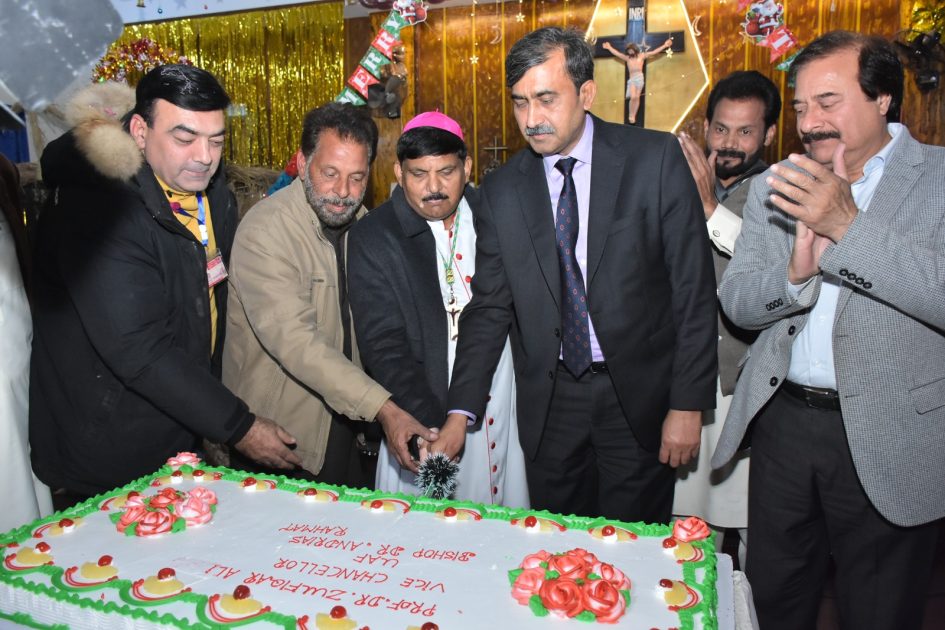 فیصل آباد:زرعی یونیورسٹی فیصل آباد کے شہباز ٹاؤن میں واقع چرچ میں کرسمس کی تقریب کا انعقاد کیا گیا۔ اس موقع پر کالونی کو جگمگاتی روشنیوں، ستاروں اور روایتی کرسمس ٹریز سے خوبصورتی سے سجایا گیا تھا۔وائس چانسلر پروفیسر ڈاکٹر ذوالفقار علی نے مسیحی مذہبی اسکالر بشپ ڈاکٹر اینڈریاس رحمت، پرنسپل آفیسر اسٹیٹ مینجمنٹ ڈاکٹر ندیم اکبر، اسٹیٹ آفیسر رانا شہزاد محمود، ریاض مسیح اور دیگر کے ہمراہ کرسمس کا کیک کاٹا۔اس موقع پر ڈاکٹر ذوالفقار علی نے کہا کہ ہمیں بھائی چارے، محبت اور رواداری کے پیغام کے ذریعے معاشرے کو خوشیوں کا گہوارہ بنانا ہے۔ انہوں نے کہا کہ یونیورسٹی نے تمام مذاہب کے پیروکاروں کو اپنی مذہبی رسومات کی ادائیگی کے لیے ایک بہترین ماحول فراہم کیا ہے۔ انہوں نے مزید کہا کہ قائد اعظم محمد علی جناح کے وژن کے مطابق پاکستان میں بسنے والوں کو تمام افراد کو مذہبی آزادی اور انسانی حقوق کے لیے سازگار ماحول فراہم کیا جاتا ہے ۔مسیحی مذہبی رہنماؤں نے اس موقع پر یونیورسٹی کے کردار کو سراہا۔